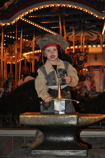 We had such a great time at this event last year that we wanted to do it again, but it didn't start out so great. Porter refused to put on his costume. We would try to put it on him, and he would take it off. Nothing worked. We bribed, we threatened, we gave pep talks. So off to dinner we went in his clothes that he had worn during the day. We told him he couldn't have candy or trick or treat if he didn't wear his costume. We pointed out other little kids in their costumes, and we even let him see another child trick or treating in our resort while we waited for dinner (they were handing out candy all over the resort). We told him he could put it on over his clothes, that he only had to wear it for a little while--while he trick or treated--but nothing. We packed it in our stroller and off we went anyway. When we got to the MK I went to the restroom and tried one last time to get him to go with me and put on his costume and he refused. When I got out and we were about to head out into the park for who knows what because we had told him he couldn't get candy without his costume, it's like the clouds parted and rays of sunlight streamed down and this little STUBBORN child was ready to put on his costume. And he even put on his pirate hat complete with dreadlocks and beads to complete the Jack Sparrow look.